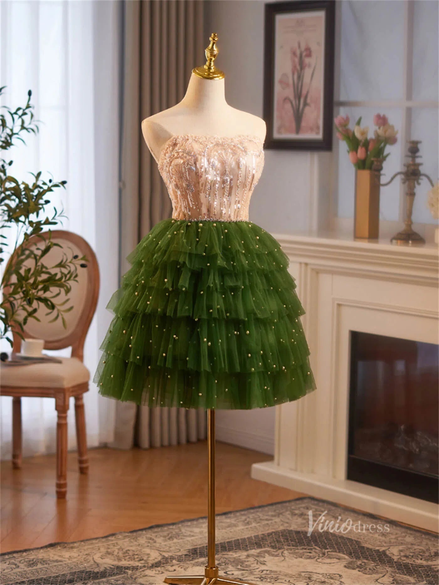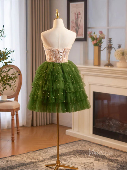 Vestido de fiesta corto de encaje sin tirantes con volantes verdes y capas BJ067
