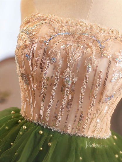 Confeccionado por expertos, este vestido verde de fiesta con volantes y capas presenta un diseño sin tirantes y un corpiño de encaje con cuentas color champán. La parte inferior de tul verde con volantes y perlas le da un toque divertido a este elegante vestido. Perfecto para la graduación o cualquier ocasión especial, este vestido irradia sofisticación y realza tu estilo único.