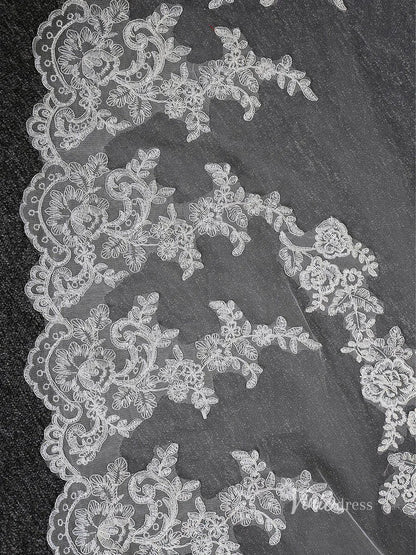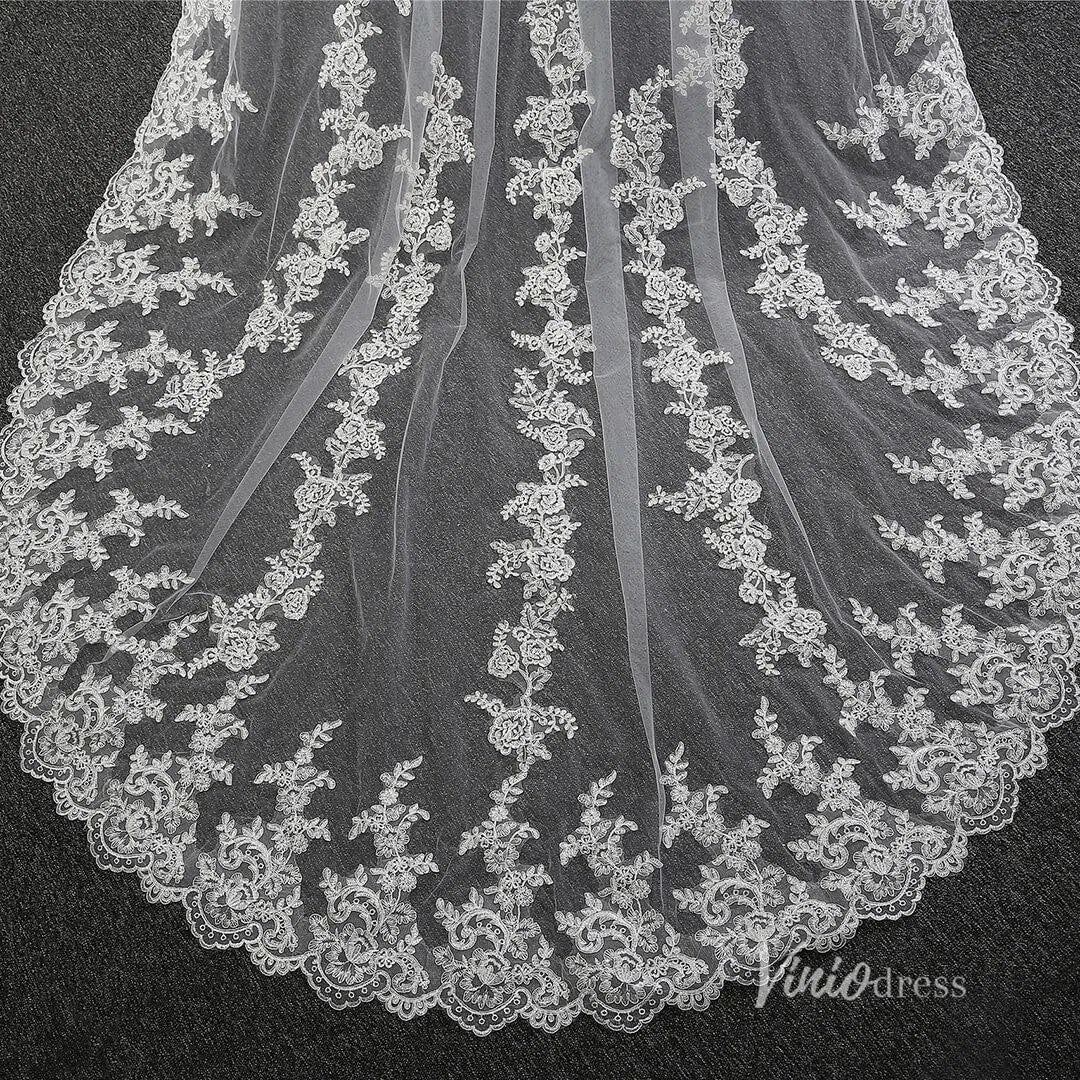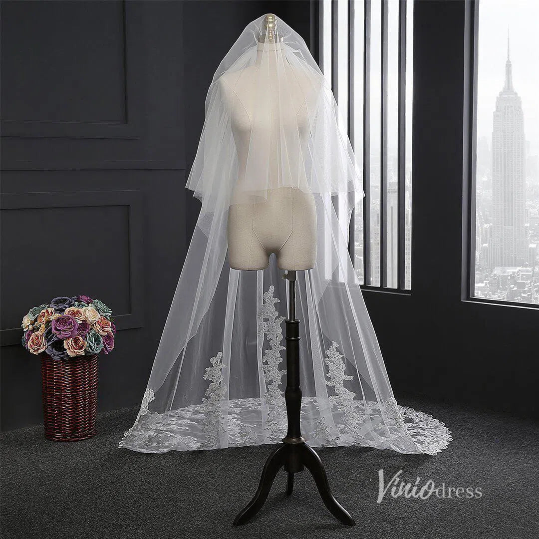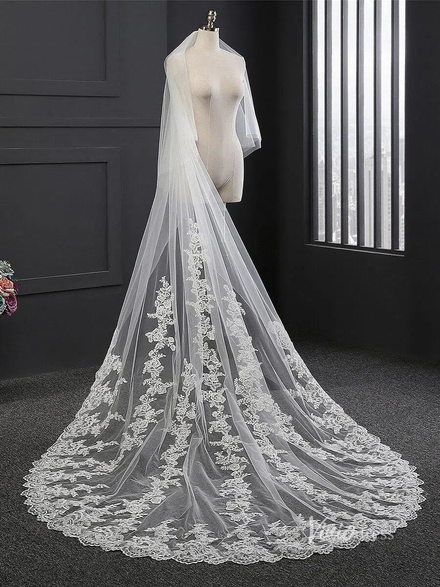 <transcy>Velo tipo catedral con aplicación de encaje y vestido de colorete</transcy>