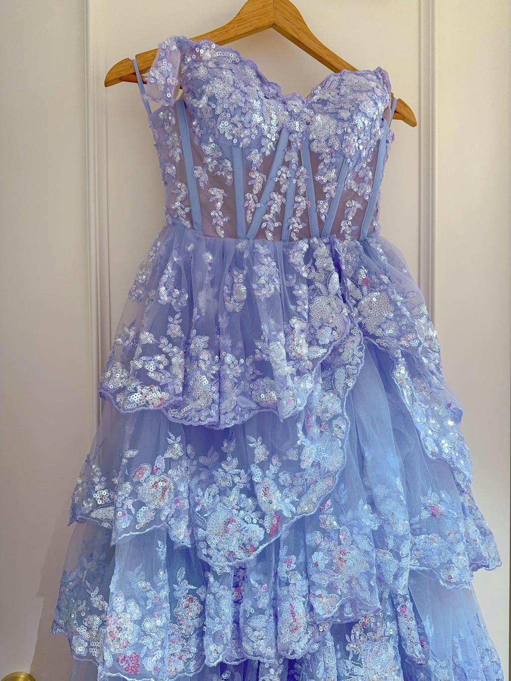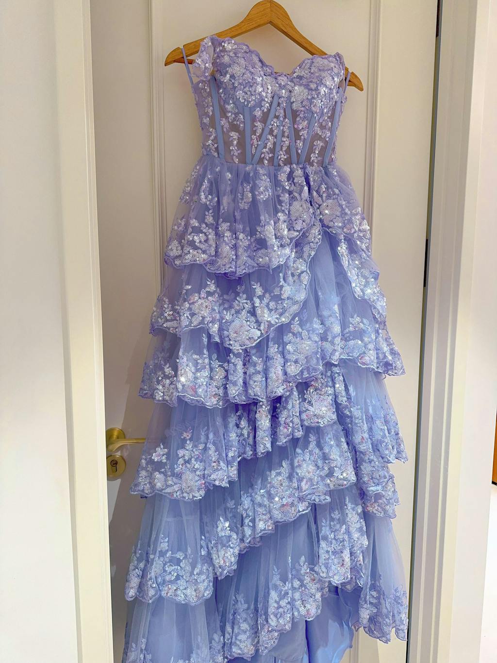 Vestidos de fiesta de encaje con lentejuelas brillantes color lavanda, vestidos con volantes escalonados y tirantes FD3636