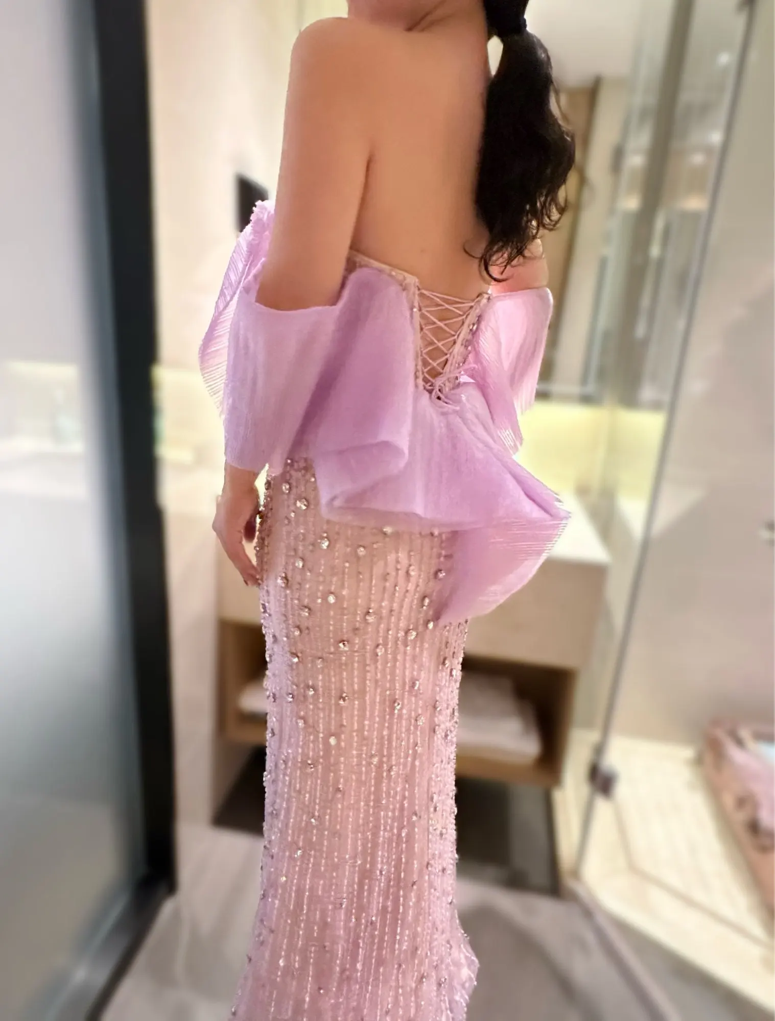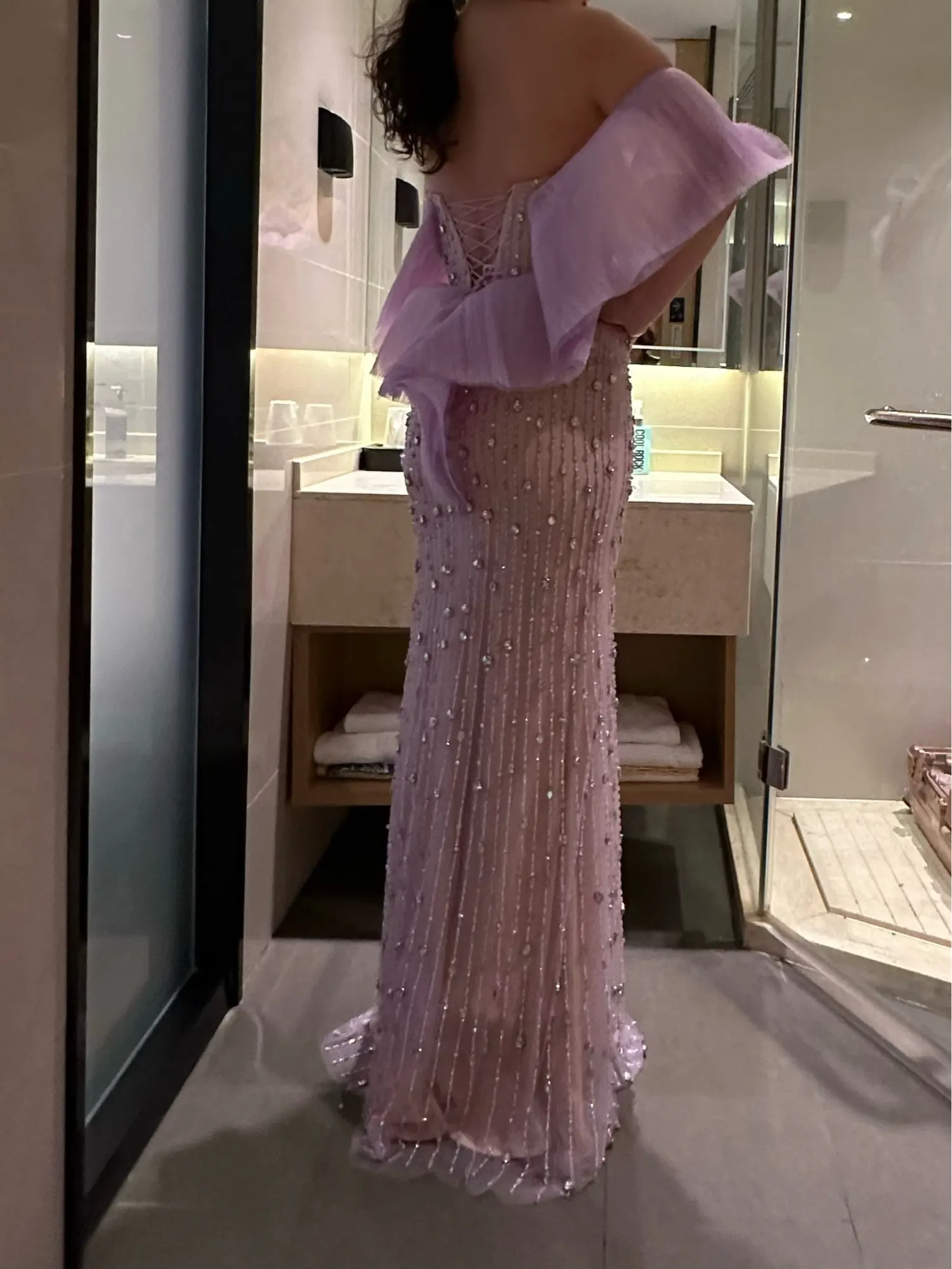 Vestidos de fiesta con cuentas transparentes en color lila, hombros descubiertos, escote corazón, vestidos formales 20218