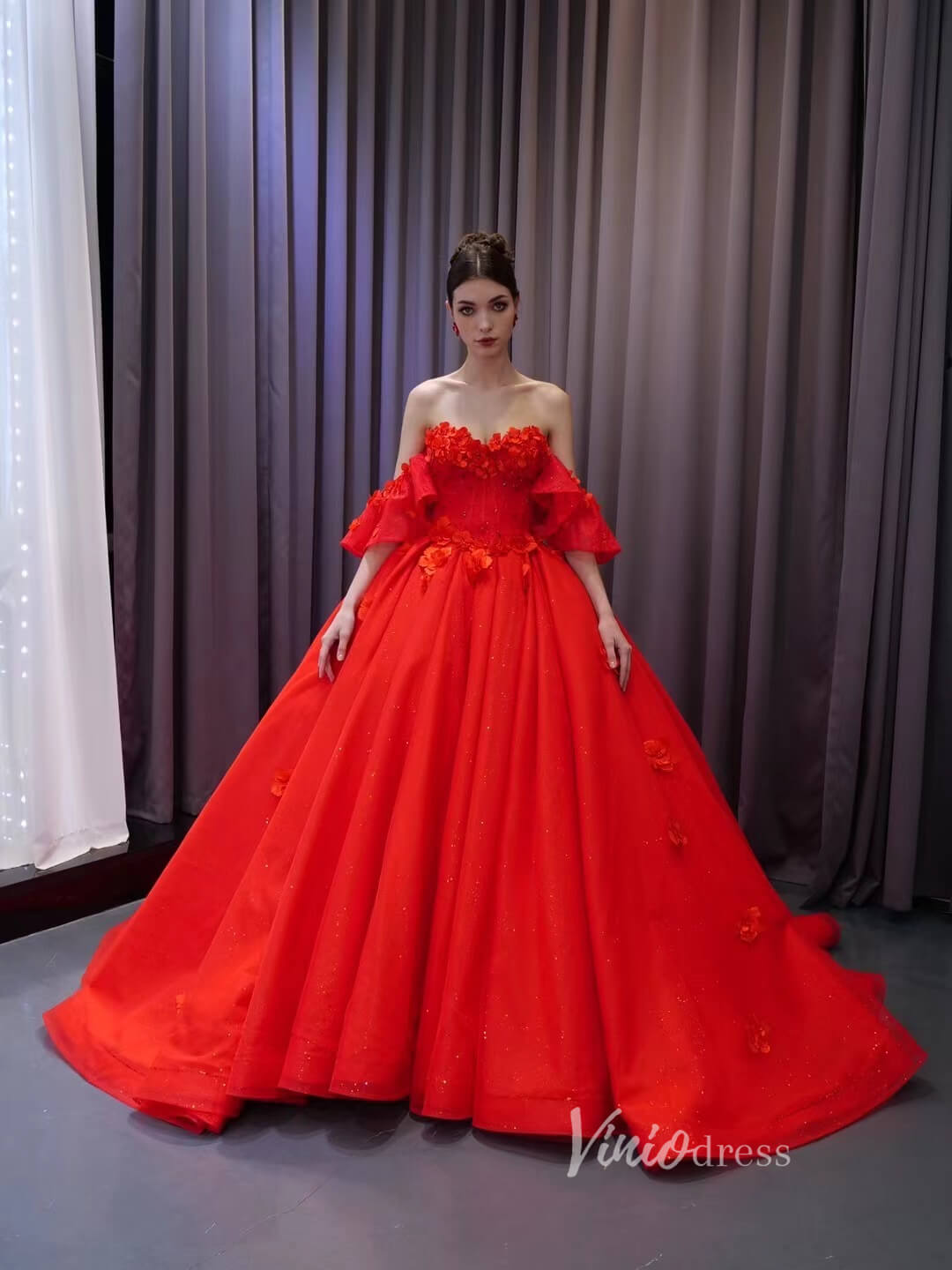 Vestidos de novia rojos brillantes de lujo, vestidos de quinceañera con flores en 3D, mangas extraíbles 231135