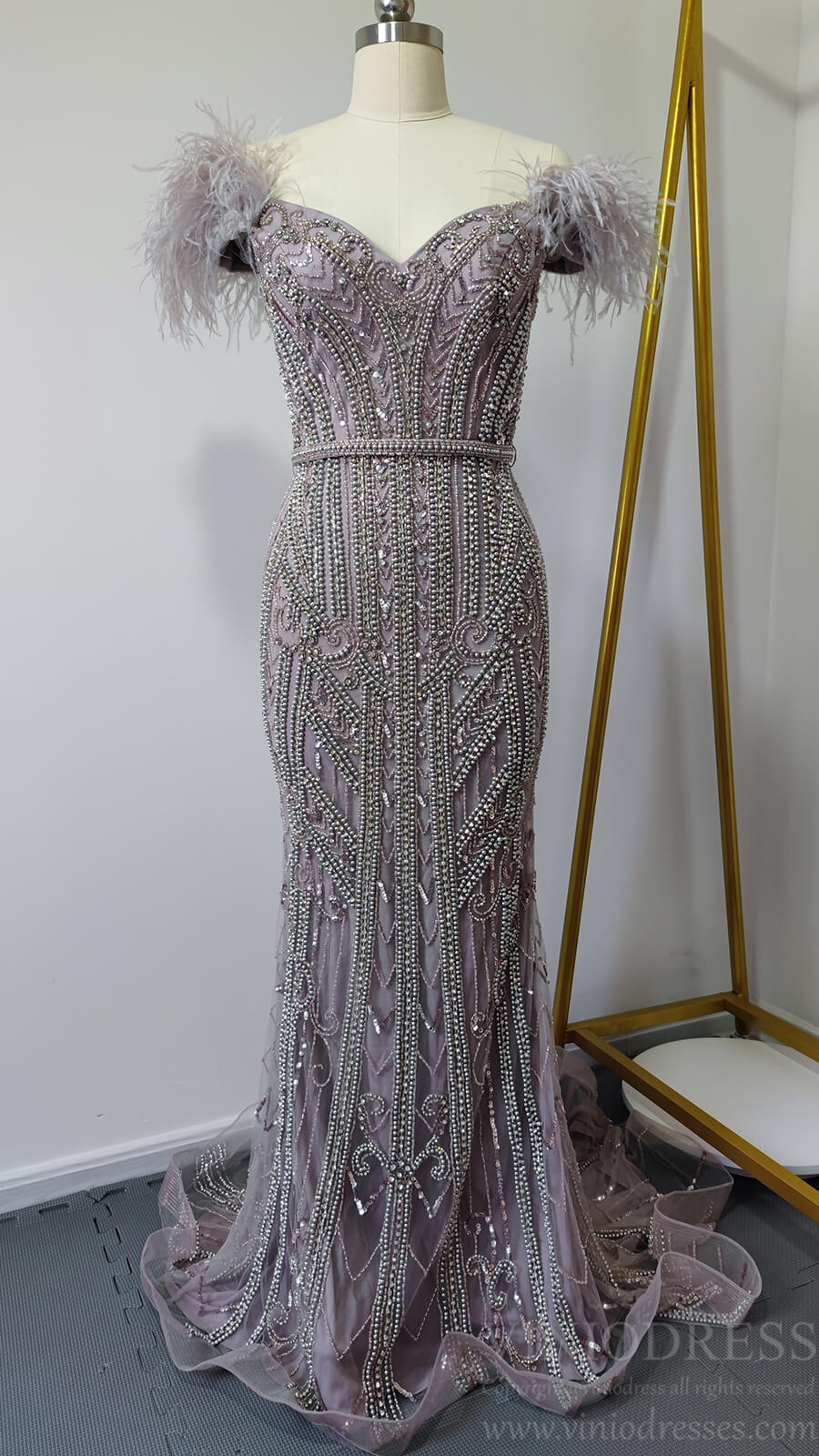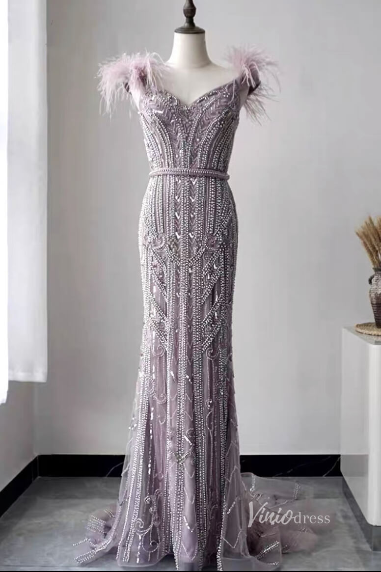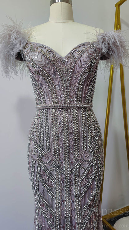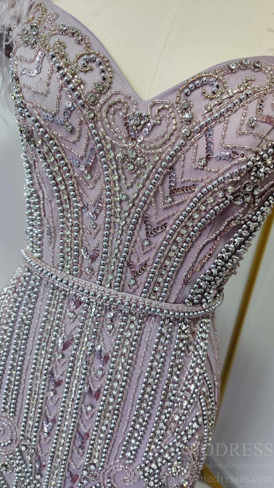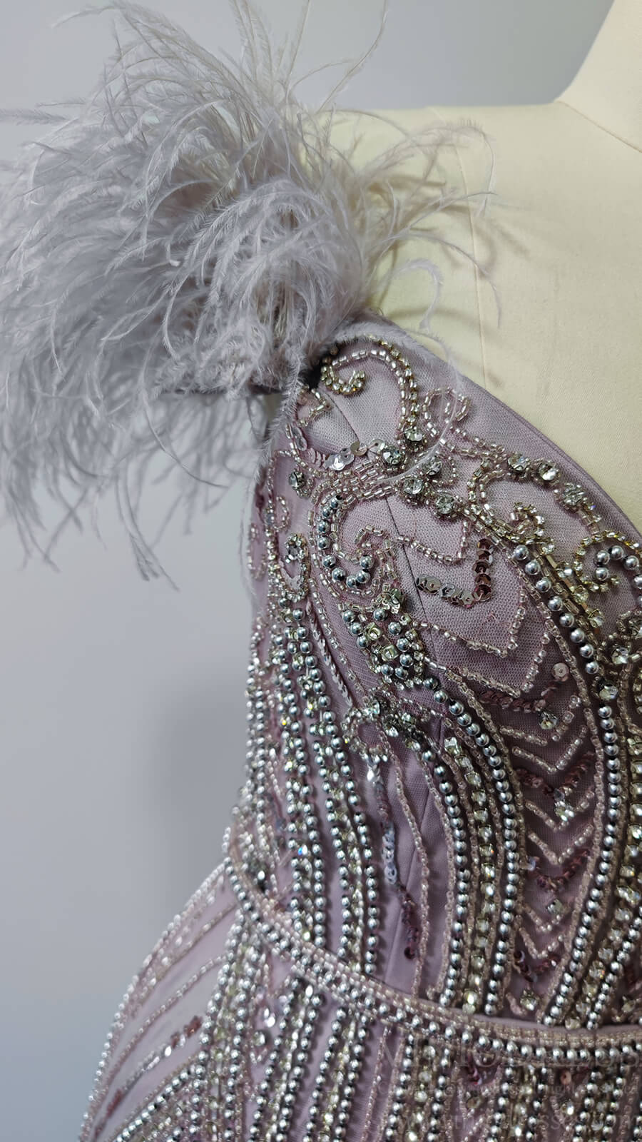 Vestido de fiesta de los años 20, color malva, con cuentas y plumas, sin hombros, FD2615