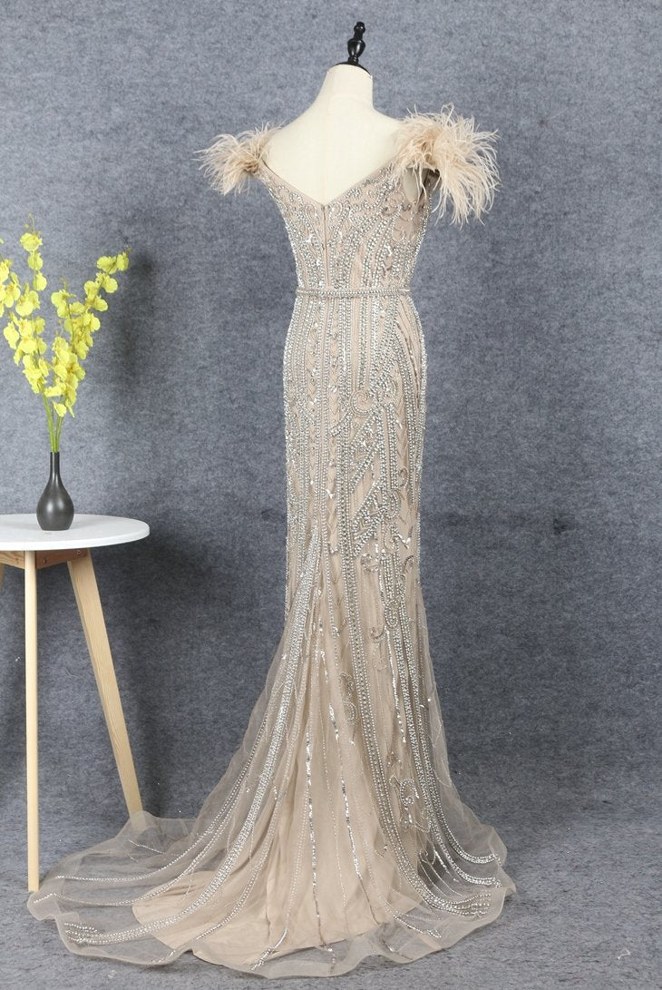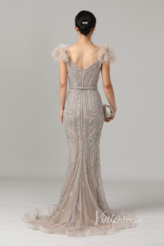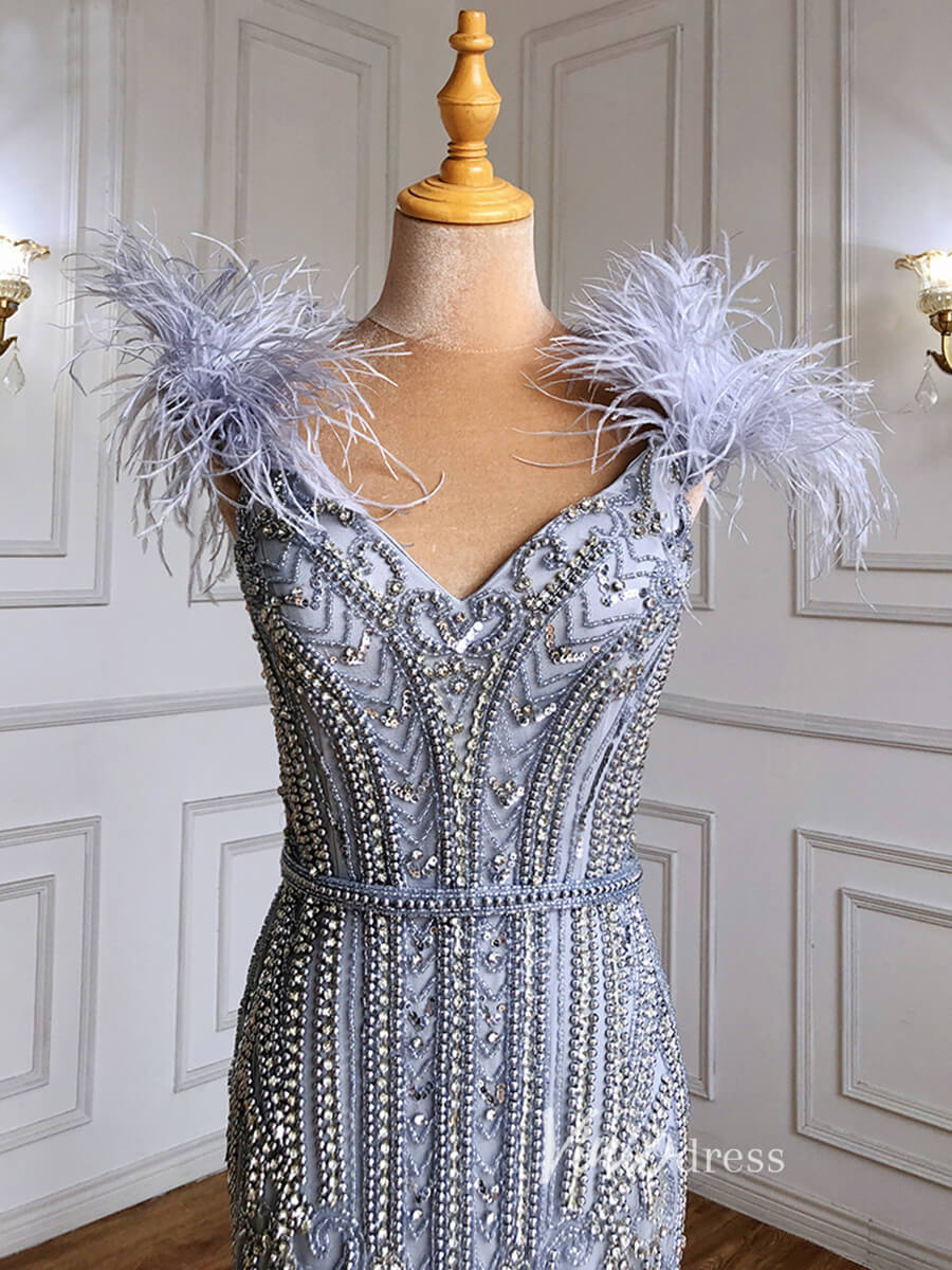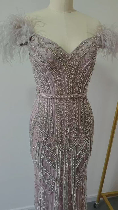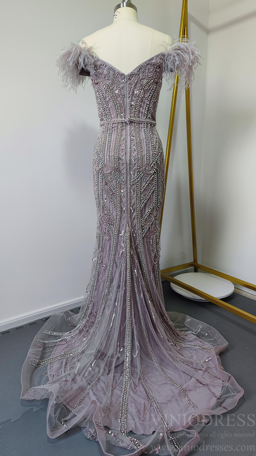Vestido de fiesta de los años 20, color malva, con cuentas y plumas, sin hombros, FD2615