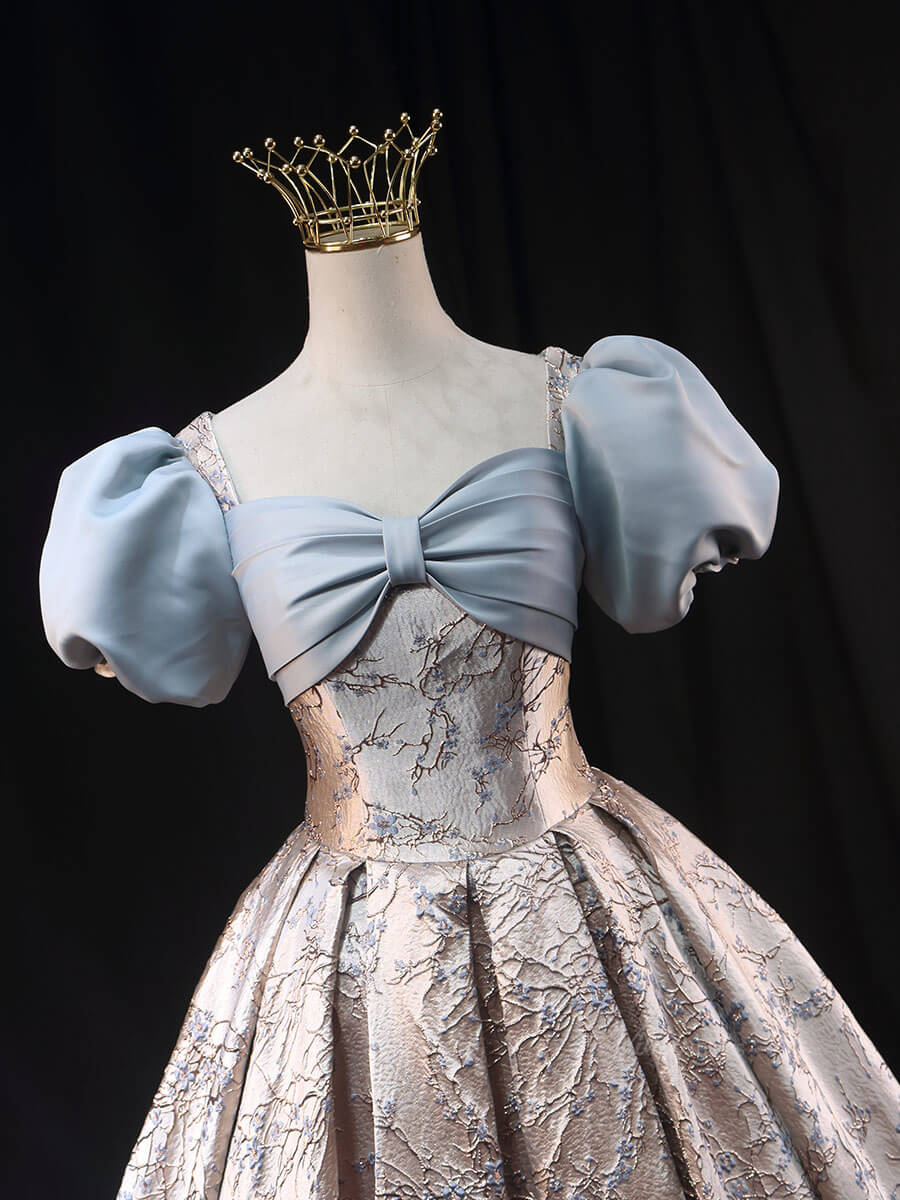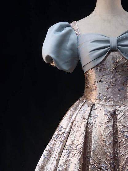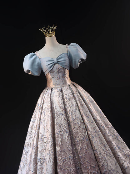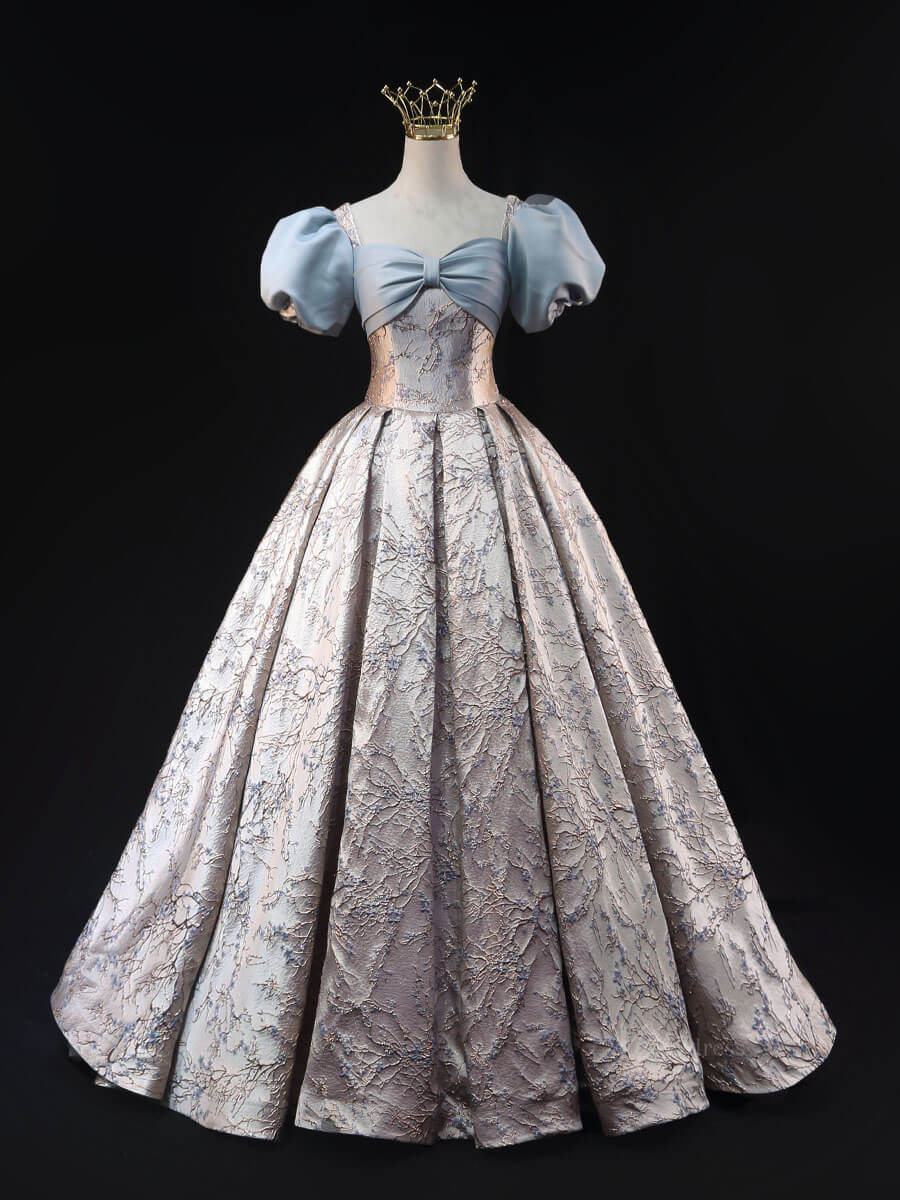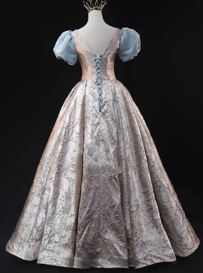 ¡Sé la reina del baile con nuestros vestidos de fiesta de jacquard rosa! Con un corpiño azul claro y una parte inferior de jacquard rosa, el vestido irradia elegancia y estilo. Las mangas abullonadas le dan un toque de fantasía, mientras que la espalda tipo corsé garantiza un ajuste perfecto. Perfecto para el baile de graduación o las quinceañeras.
