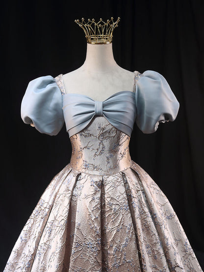 Vestidos de fiesta de jacquard rosa con mangas abullonadas y espalda de corsé, vestidos de quinceañera SU001