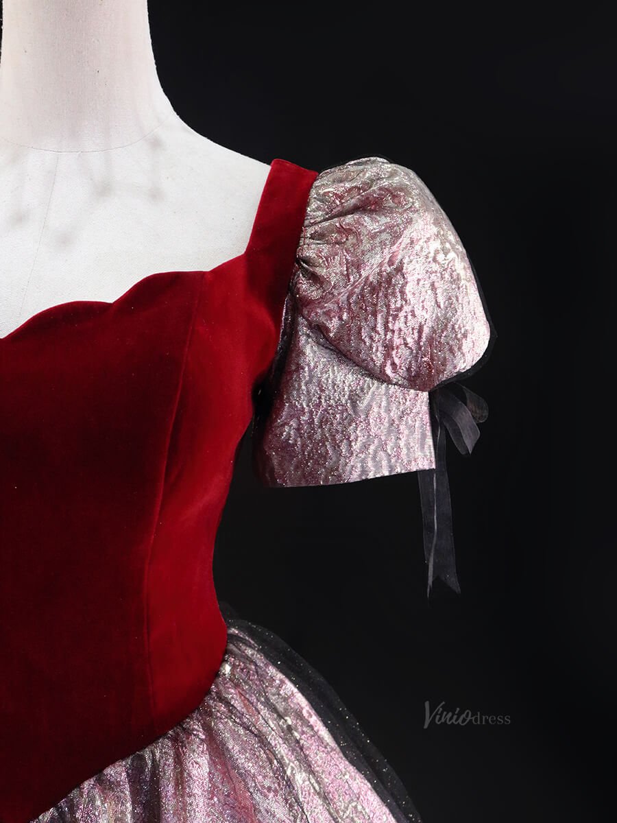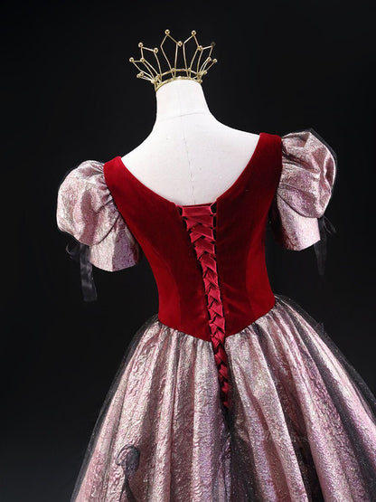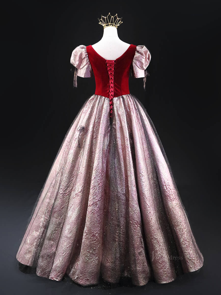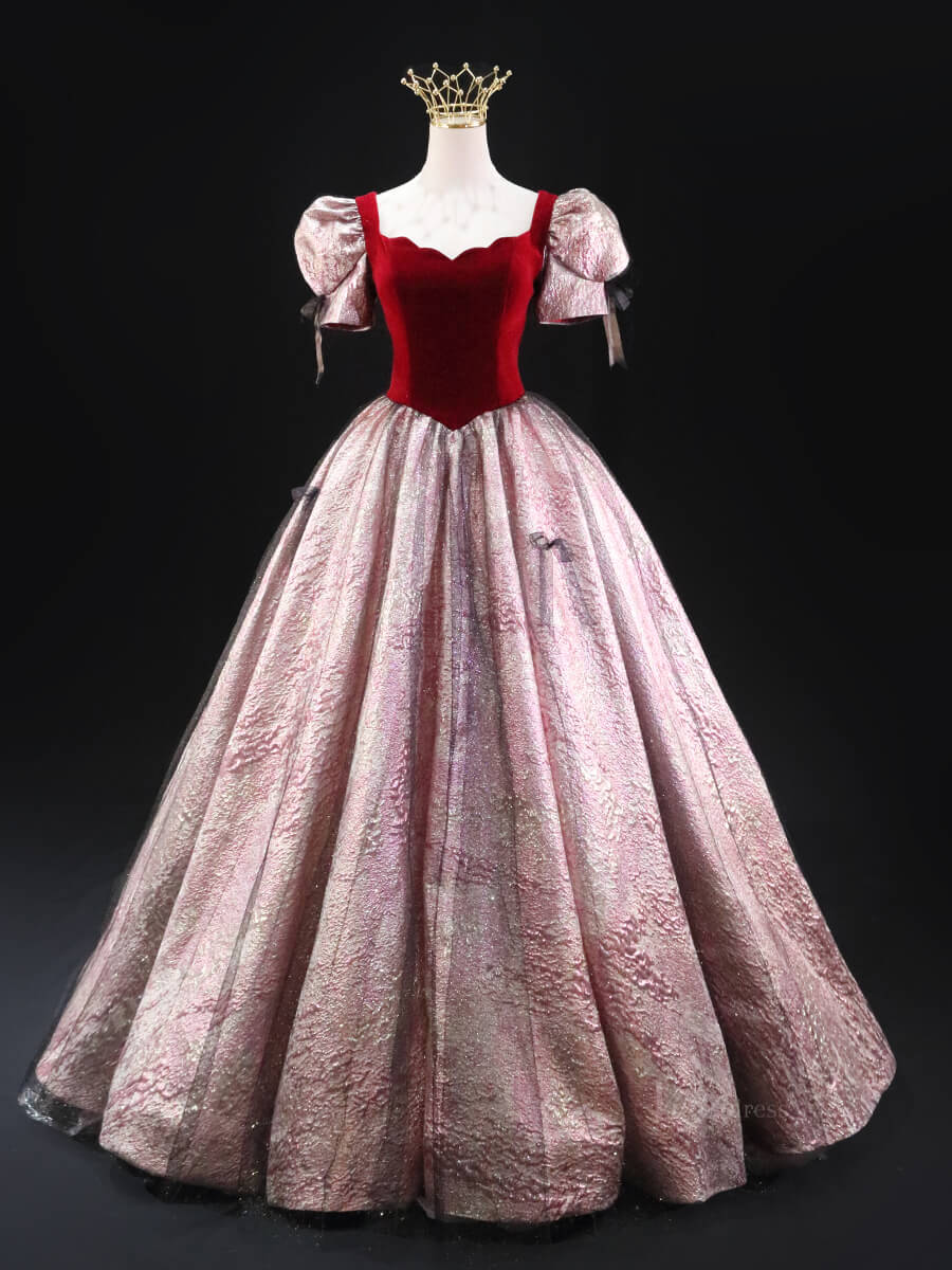 Vestidos de fiesta de jacquard rosa con mangas abullonadas y corpiño de terciopelo rojo, vestidos de quinceañera SU024