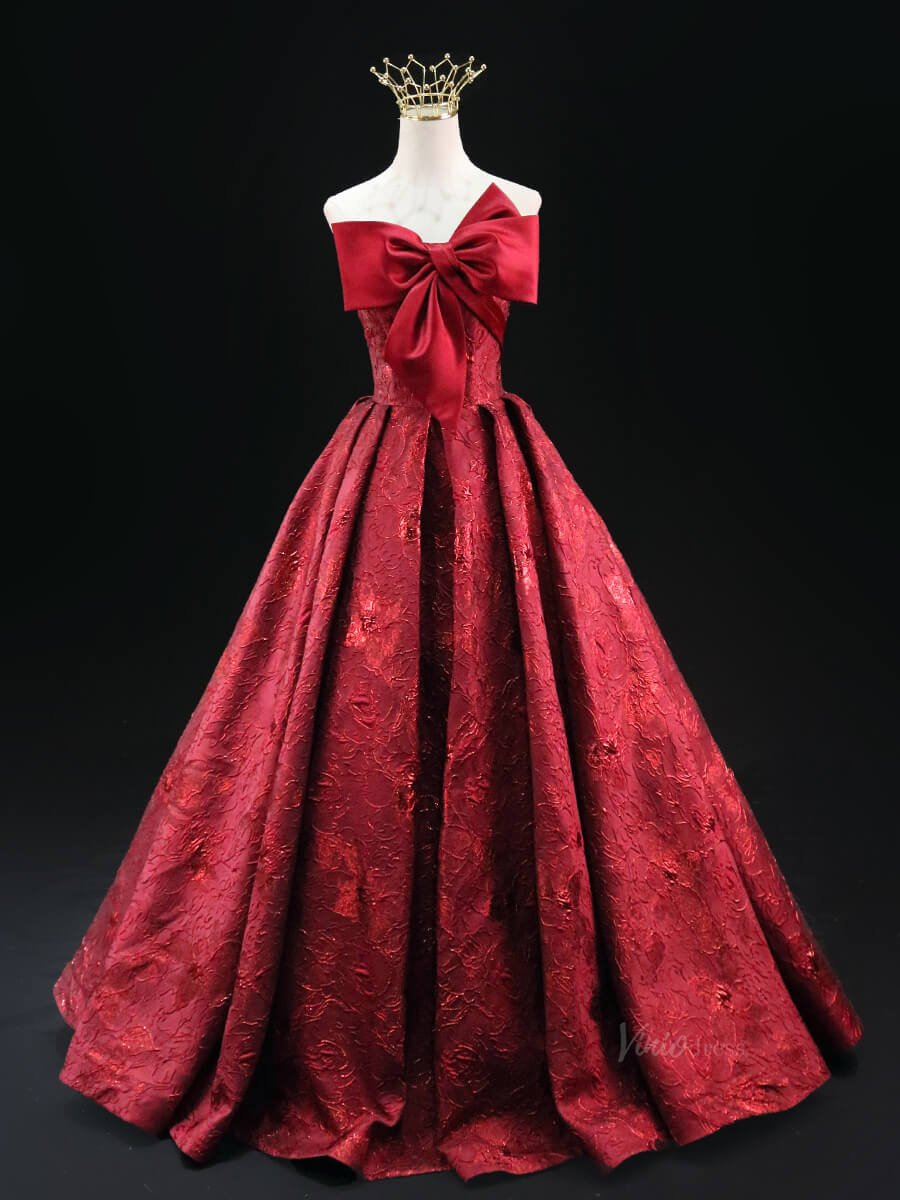 Vestidos de fiesta de jacquard rojo con lazo, espalda de corsé y sin tirantes para quinceañera SU034