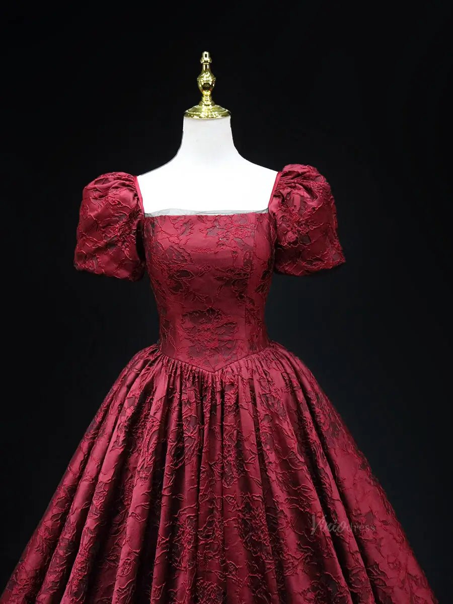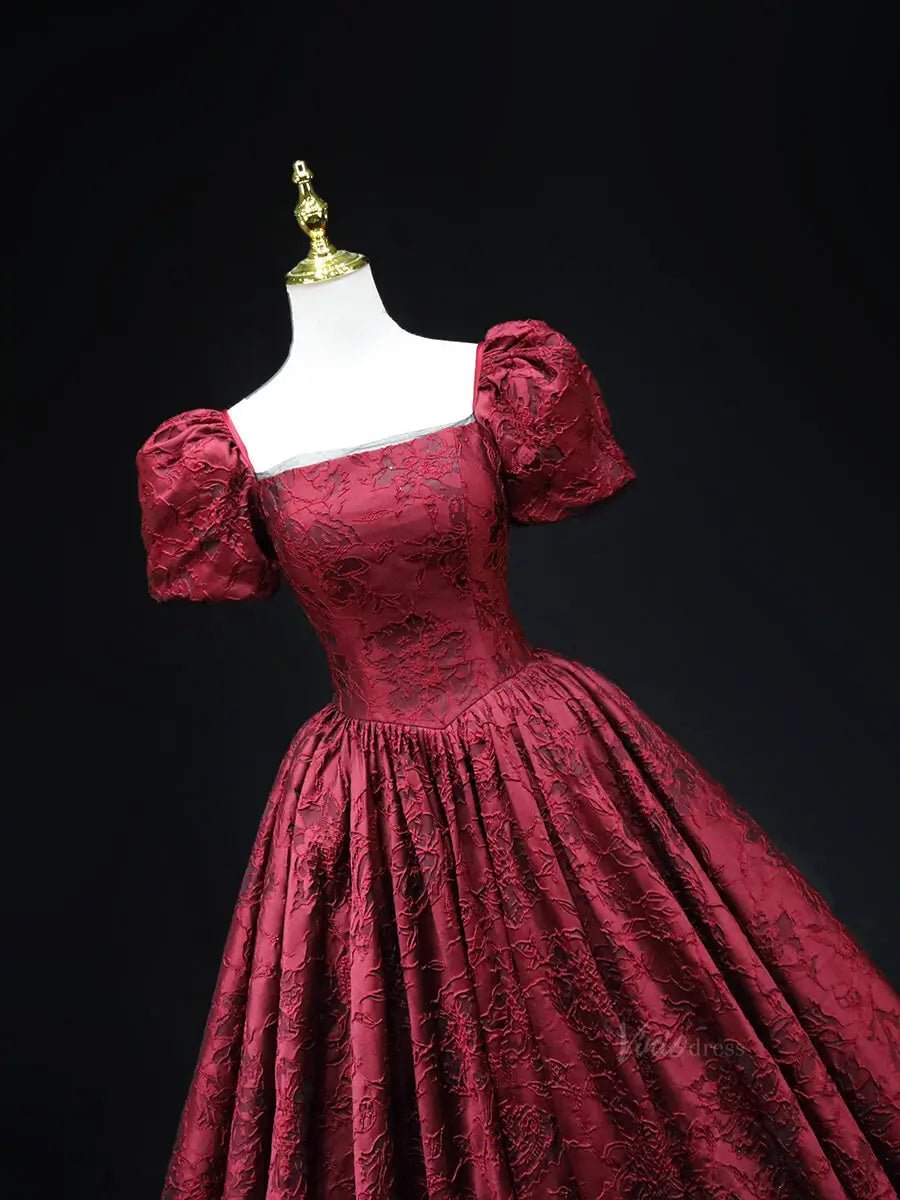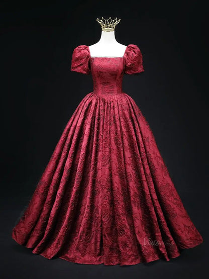 Vestidos de fiesta de jacquard rojo con mangas abullonadas y escote cuadrado, vestidos de quinceañera SU044