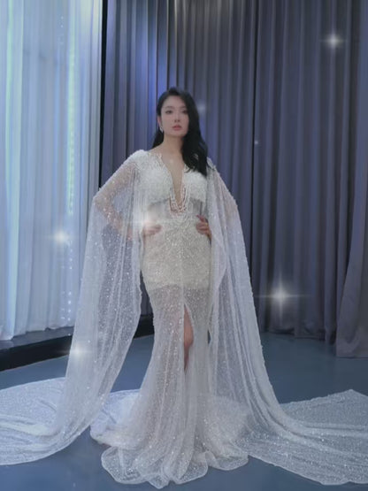 Vestidos de novia de perlas modernos y transparentes con mangas tipo capa extralargas 222107