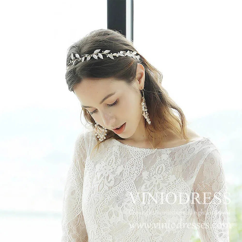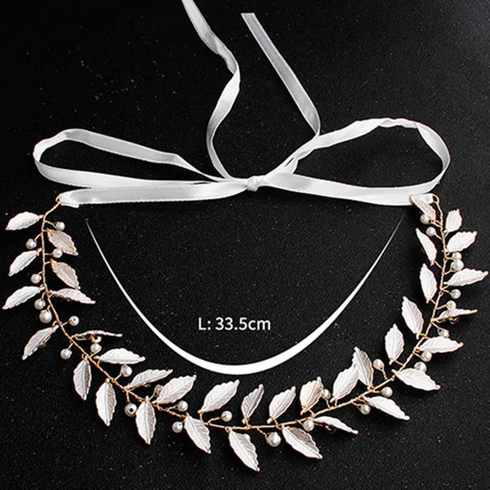 Esta hermosa y sencilla diadema presenta hojas de laurel de metal y ramitas de perlas trenzadas a mano.