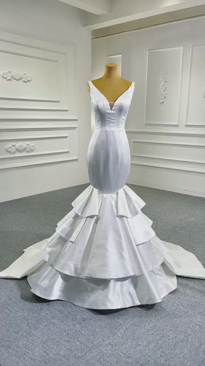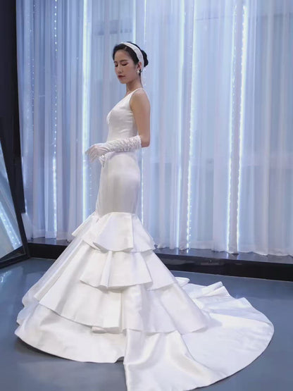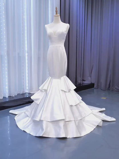 Sencillo vestido de novia sirena elaborado con satén de alta calidad, con falda con volantes.