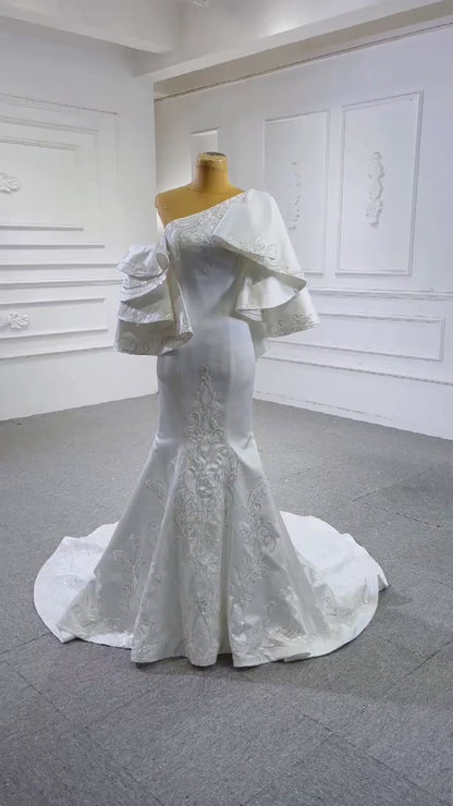 Vestido de novia sirena en raso con aplicaciones de encaje de lentejuelas, escote asimétrico y manga con volante.
