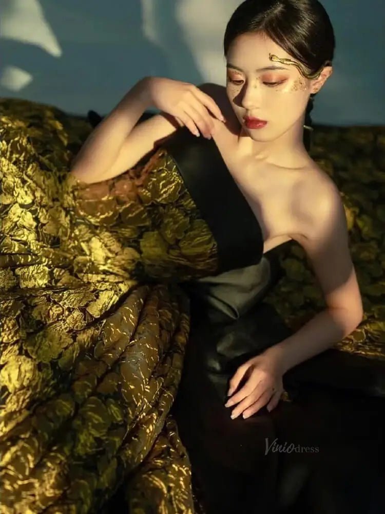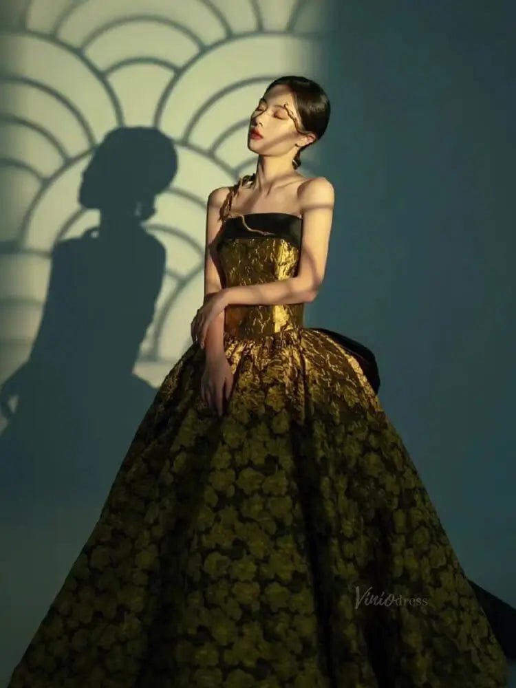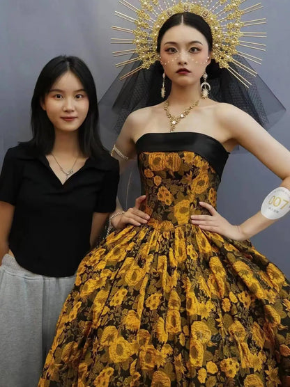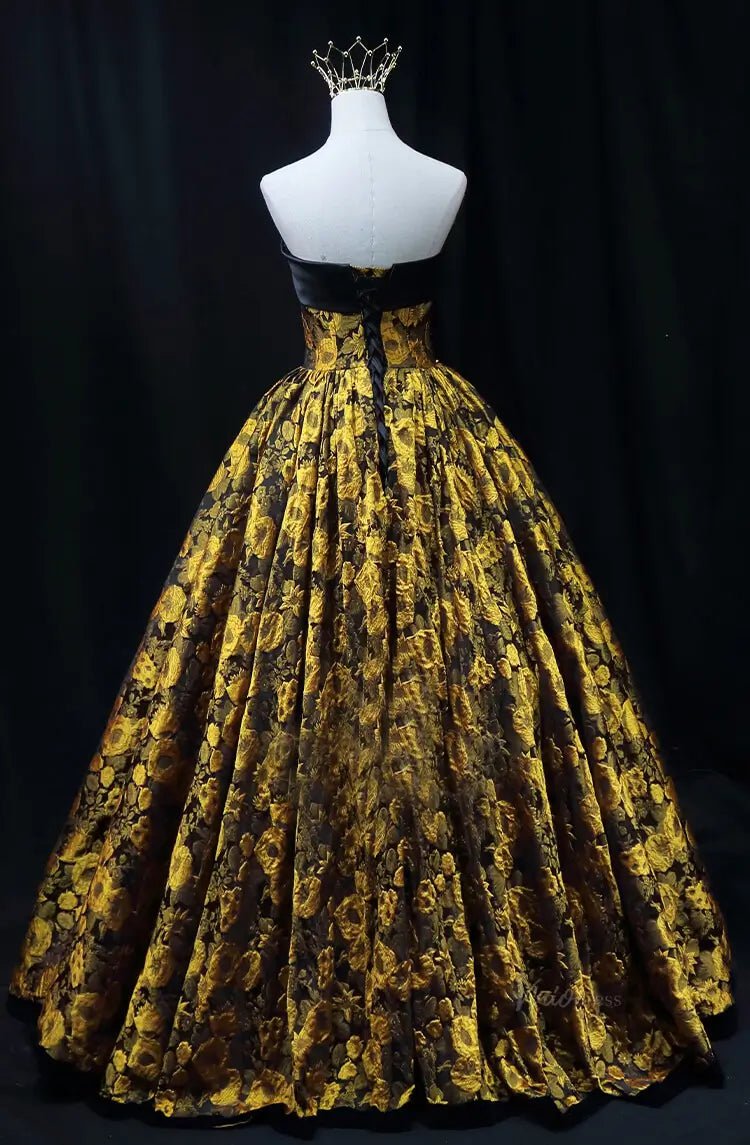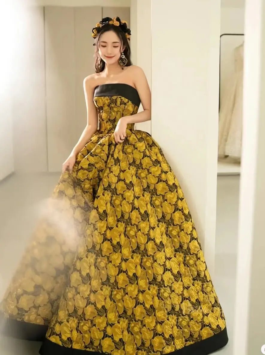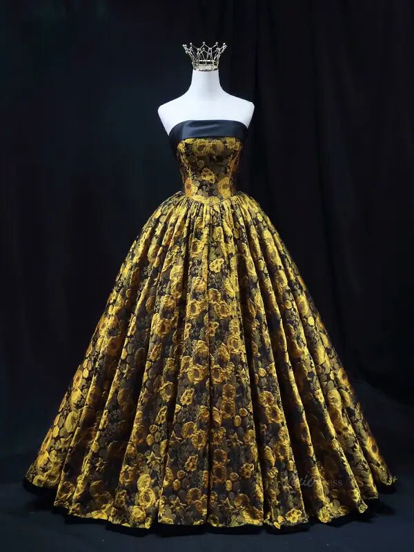 Vestidos de fiesta con estampado floral en jacquard amarillo, sin tirantes, para quinceañera, SU079