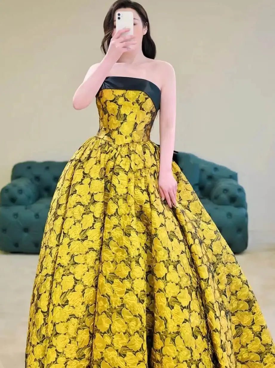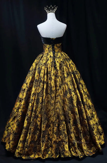 Luce un estilo único con este atrevido vestido amarillo sin tirantes con un impresionante diseño floral en jacquard. Perfecto para cualquier ocasión aventurera, este vestido sin duda llamará la atención y te hará destacar entre la multitud. ¡Despierta tu lado atrevido con este vestido de quinceañera!