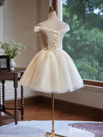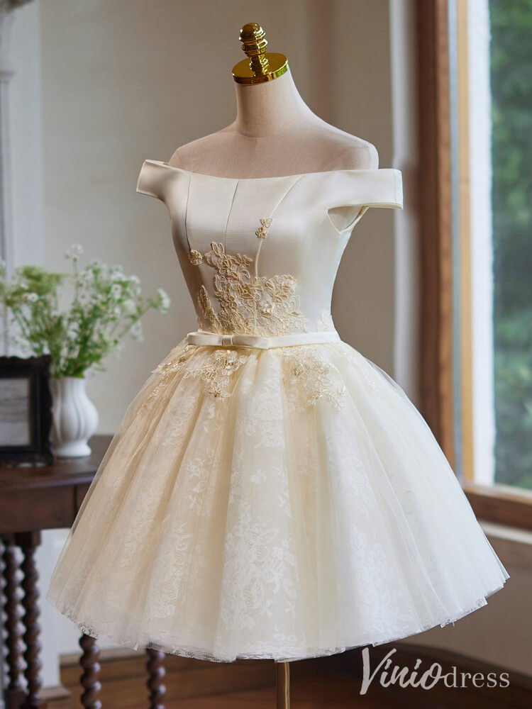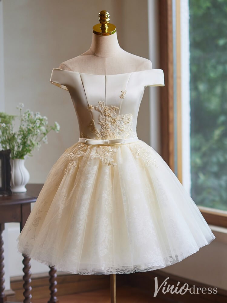 Vestido de fiesta con apliques de encaje color champán y hombros descubiertos BJ053