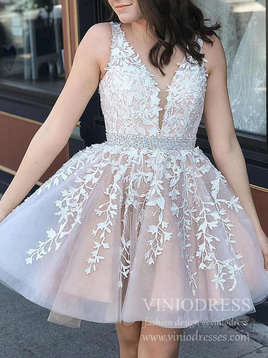 Robes de soirée courtes en dentelle rose blush, col en V, SD1177