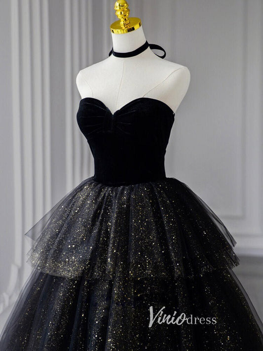 Robes de bal en Tulle scintillant noir robe formelle sans bretelles à volants FD3245
