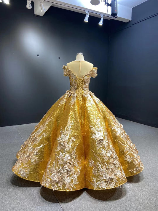 Robe de bal à paillettes dorées, fleurs 3D, robes de Quinceañera, 66536C, épaule transparente