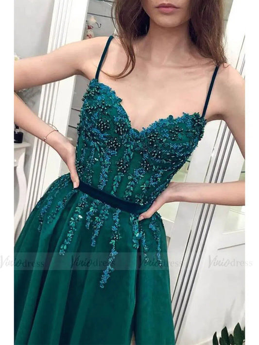 Robes de bal vert émeraude perlées à bretelles spaghetti avec fente FD1628