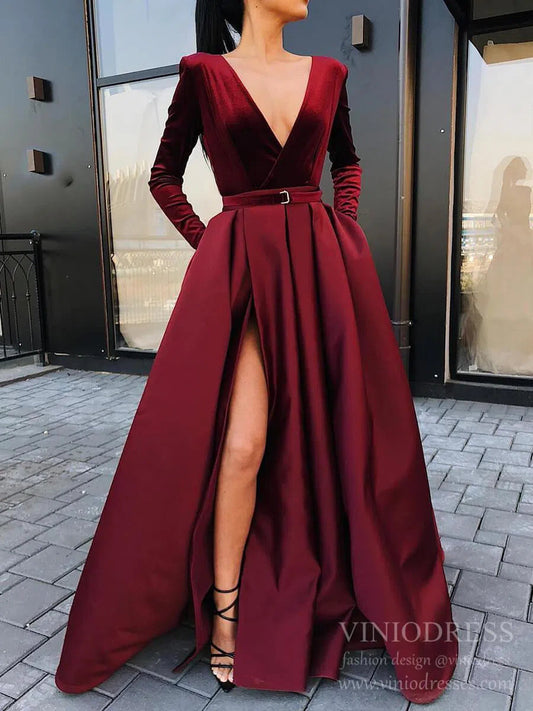 Robes de bal noires et bordeaux à manches longues et col en V avec poches FD1595