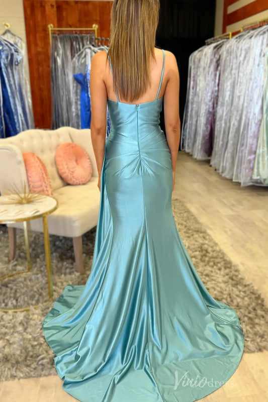 Robes de bal en satin Aqua avec robe de soirée fendue à bretelles spaghetti FD3345