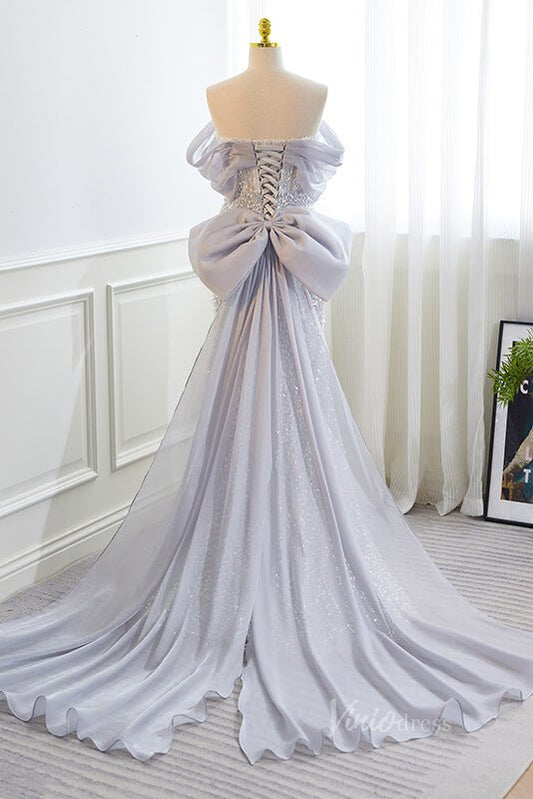 Dusty Blue Tulle Prom Dresses with Puffed Sleeve, Bow, Beaded Quinceanera Dresses SU012