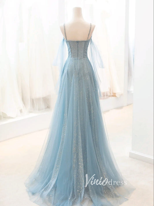 Dusty Blue Sparkly Tulle Prom Dresses with Extra Long Sleeve, Beaded Bodice, V-Neck, Quinceanera Dresses SU032
