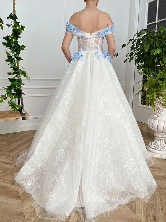 Robes de bal en dentelle florale bleue 3D avec poches sur l'épaule FD3031