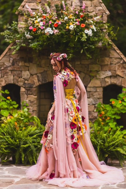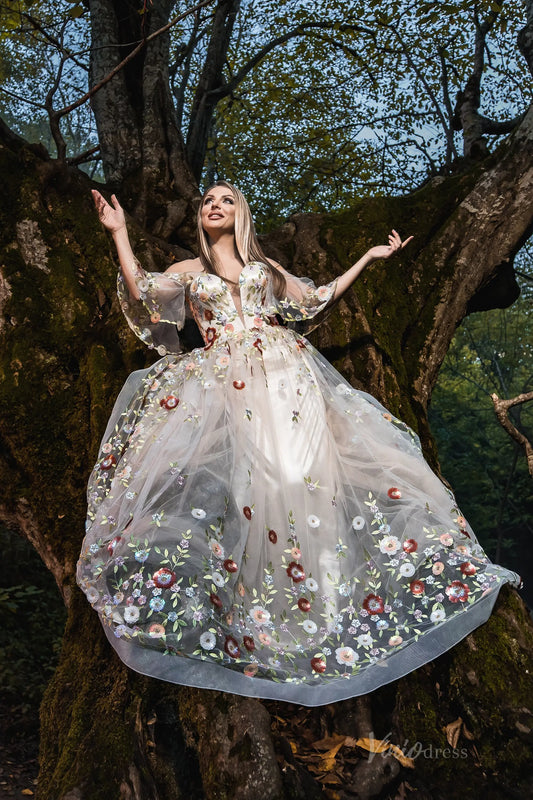 Whimsical Floral Tulle Wedding Dress with Puffy Sleeves and Sweetheart Neckline FW164