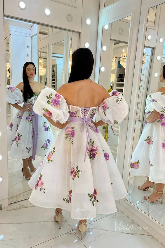 Whimsical Lavender Floral Embroidered Off-Shoulder Midi Wedding Dress with Puff Sleeves & Ribbon Waist – FW245