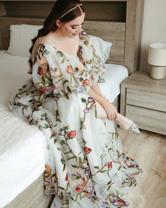 Whimsical Meadow Floral Wedding Dress with Long Sleeves| V-Neck Backless Gown FW101