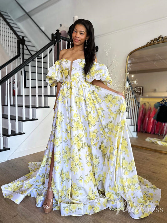 Yellow Floral Off-Shoulder Puff Sleeve Prom Dress with Slit – FD6119
