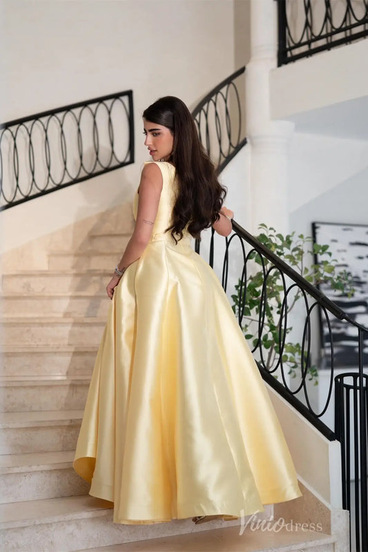 Yellow Satin Corset Prom Dress with Sweetheart Neckline, Beaded Bodice, High Slit, Spaghetti Straps, Sash – SS097