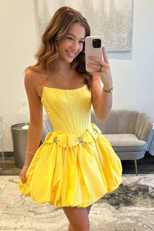Yellow Strapless Satin Homecoming Dress with Crystal Beaded Neckline, Corset Bodice & Bubble Hem Skirt – H1202