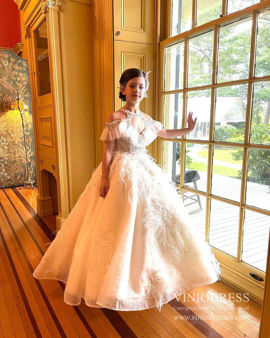 Robes de bal de luxe en dentelle de plumes pour petites filles KD1030