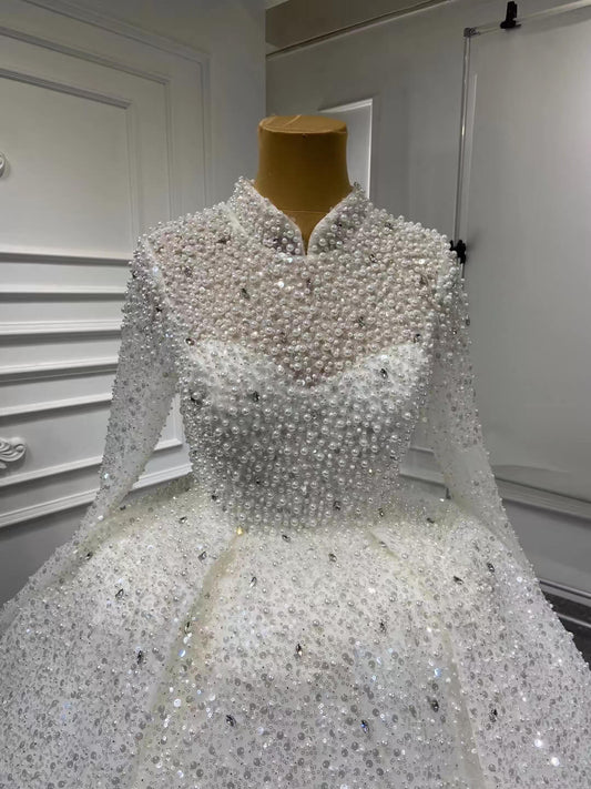 Robe de mariée de luxe perlée, épaules dénudées, manches longues, 67276