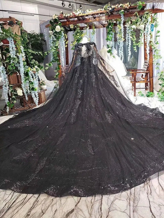 Robe de mariée noire pailletée robe de bal vintage manches longues 67500