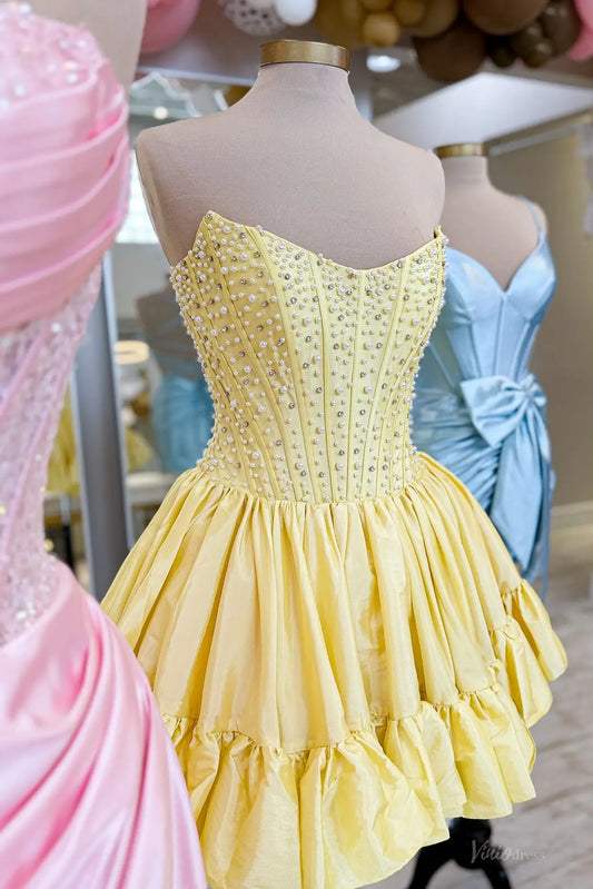 Yellow Sparkly Mini Homecoming Dress with Sweetheart Neckline, Corset Bodice & Ruffle Hem – H1209