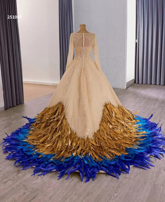 Luxury Gold & Blue Feather Wedding Dress with Sleeves 251007