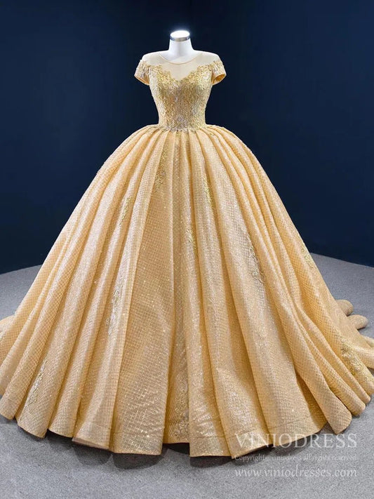Robe de coing en dentelle dorée scintillante, robe de bal à manches cape, robe de princesse de bal 67217 viniodress