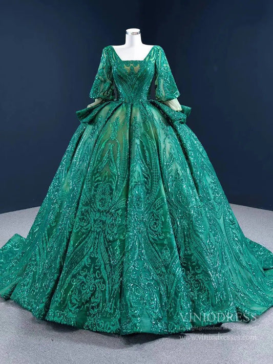 Robe de bal de promo en dentelle à paillettes vertes scintillantes, robe de princesse avec manches 3/4 bouffantes 67223 viniodress