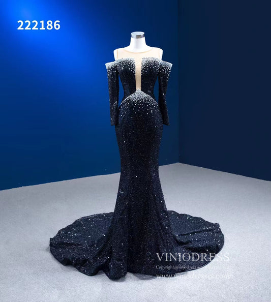 Robes de mariée noires à manches longues, robe de concours perlée 222186