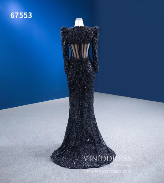 Robes de soirée formelles sirène noire perlée à manches longues robes de concours 67553