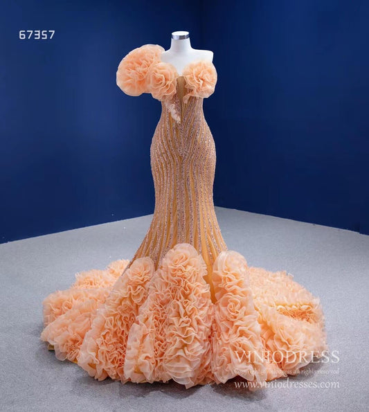 Robe de concours de beauté sirène perlée dorée, asymétrique épaule dénudée, robe de bal à volants 67357 viniodress