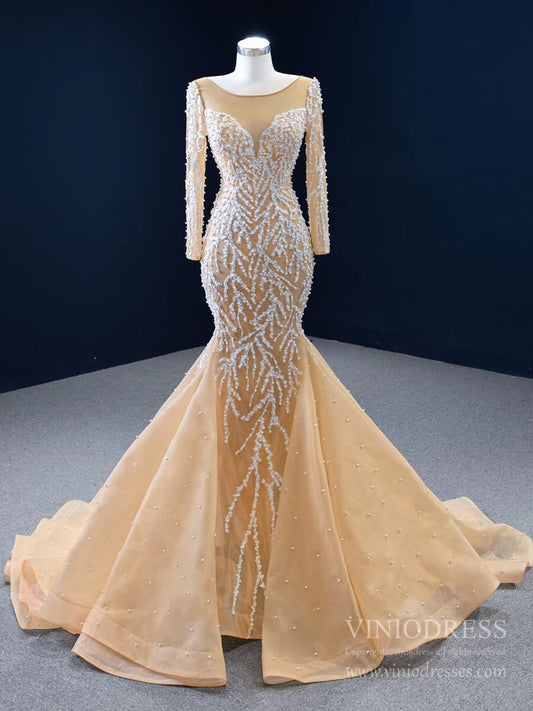 Robe de mariée sirène or clair perlée à manches longues 67211 viniodress