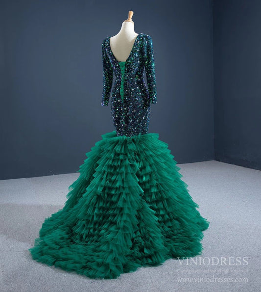 Robe de bal sirène vert émeraude, manches longues, robe formelle à plusieurs niveaux, FD2451 viniodress