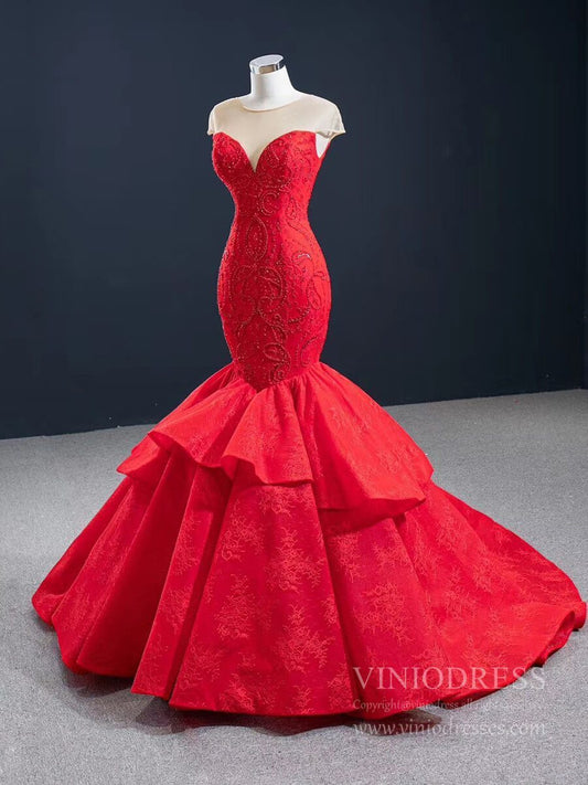 Illusion épaule rouge sirène robes de mariée robe de bal perlée 67149 viniodress