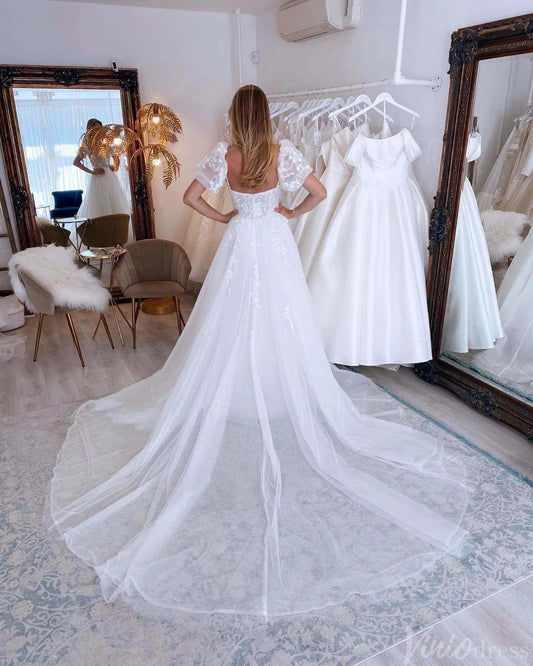 Rustic Lace Applique Wedding Dresses with Slit Puffed Sleeve Bridal Gown AW1012