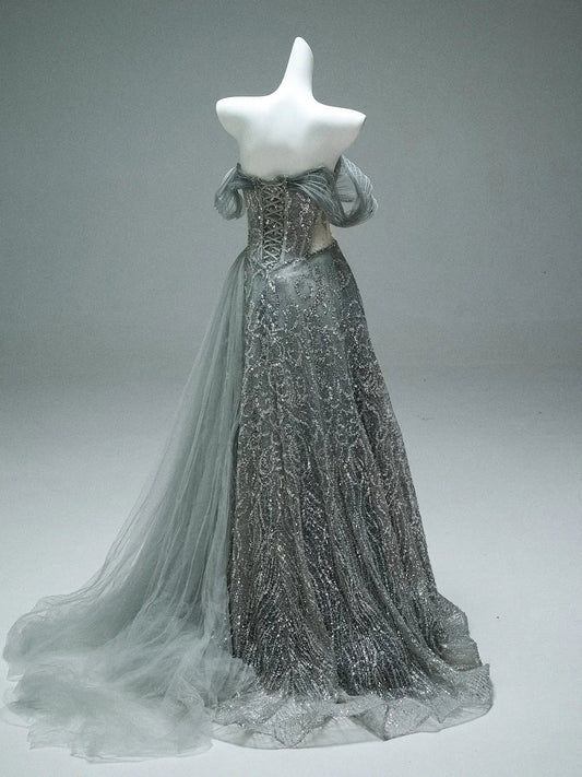 Grey Off the Shoulder Evening Gown with Sparkly Tulle, Overskirt & Lace-Up Back - CQ0106